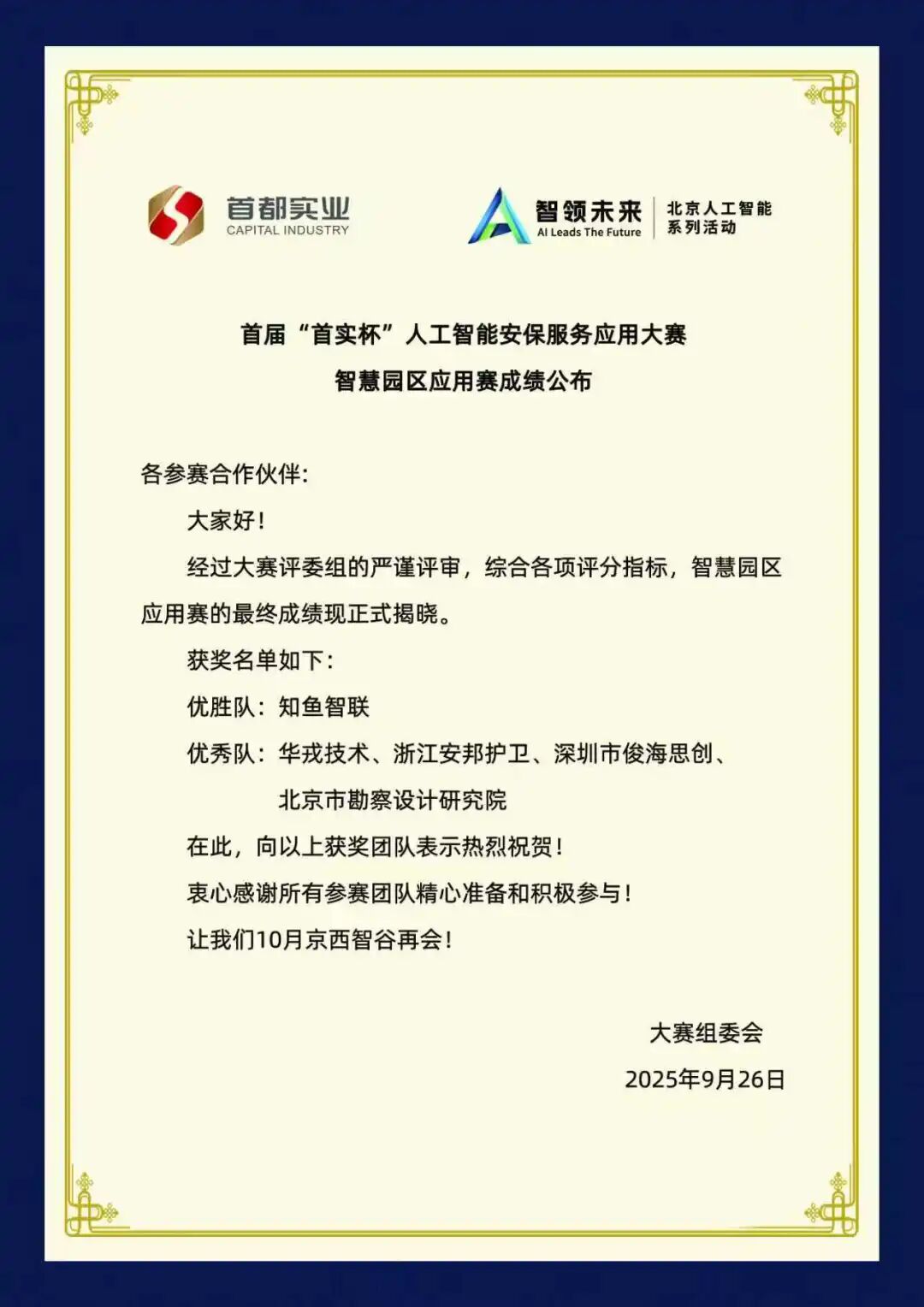 在成果展现场,三大赛道获奖名单正式揭晓。其中,电子城数智平台旗下知鱼智联,凭借为首都实业旗下子公司北京振远护卫试点基地定制的“AI+安防”解决方案在“应用赛”智慧园区系统赛道中,获首届“首实杯”优胜奖。