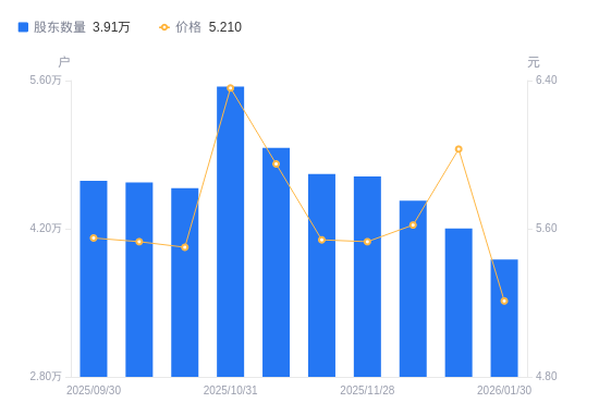 近一年(2025年2月20日至2026年1月30日),电子城A股股东户数从3.38万户,增加至3.91万户,增幅15.62%,区间股价上涨11.09%。
