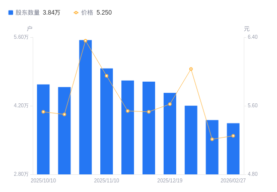 近一年(2025年2月28日至2026年2月27日),电子城A股股东户数从3.34万户,增加至3.84万户,增幅15.21%,区间股价上涨11.94%。