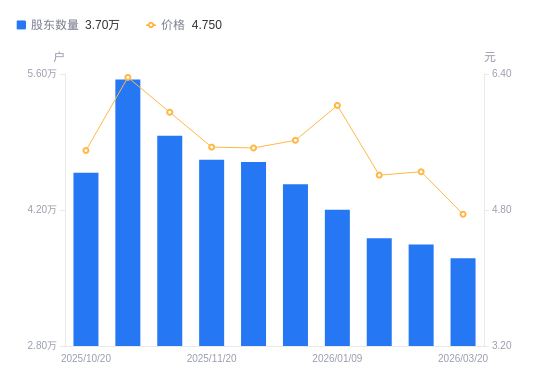 3月23日消息,数据显示,截至2026年3月20日,电子城A股股东总户数为3.7万户,较上期(2026年2月27日)减少1418户,降幅3.69%。公司最新A股总股本为11.19亿股,其中流通A股11.19亿股,户均持有流通A股数量为3.02万股,较上期增加1114.26股,增幅3.83%;户均持流通A股市值14.35万元,较上期减少9255.12元,降幅6.06%。