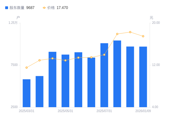 1月16日消息,数据显示,截至2026年1月9日,天目药业A股股东总户数为9687户,较上期(2025年9月30日)减少6户,降幅0.06%。公司最新A股总股本为1.22亿股,其中流通A股1.22亿股,户均持有流通A股数量为1.26万股,较上期增加7.78股,增幅0.06%;户均持流通A股市值21.95万元,较上期减少9784.6元,降幅4.27%。