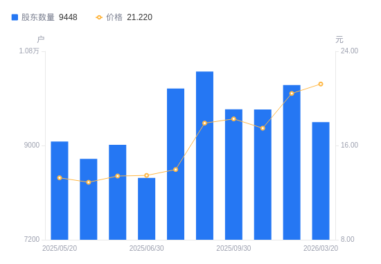3月25日消息,数据显示,截至2026年3月20日,天目药业A股股东总户数为9448户,较上期(2026年2月13日)减少707户,降幅6.96%。公司最新A股总股本为1.22亿股,其中流通A股1.22亿股,户均持有流通A股数量为1.29万股,较上期增加896.94股,增幅7.48%;户均持流通A股市值27.34万元,较上期增加2.86万元,增幅11.69%。