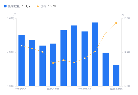 近一年(2025年3月31日至2026年3月10日),川投能源A股股东户数从6.67万户,增加至7.31万户,增幅9.58%,区间股价上涨0.38%。