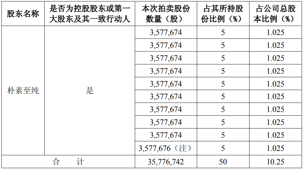 此次公告显示,若本次拍卖事项竞拍成功且完成后续股份变更过户手续,朴素至纯持有公司股份总数将下降变更为3577.67万股,预计占公司总股本的10.25%,公司的控股股东和实际控制人暂未发生变化,但后续控股股东和实际控制人的变化存在不确定性。