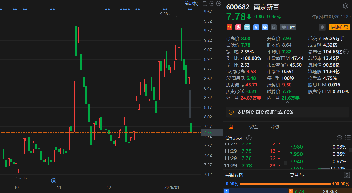 格隆汇1月20日|南京新百(600682.SH)跌停,报7.78元,近几日走出大涨大跌的“A杀”行情,总市值104.65亿元。