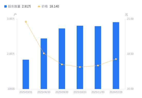近一年(2025年3月31日至2026年2月28日),大商股份A股股东户数从1.84万户,增加至2.91万户,增幅58.23%,区间股价下跌13.99%。