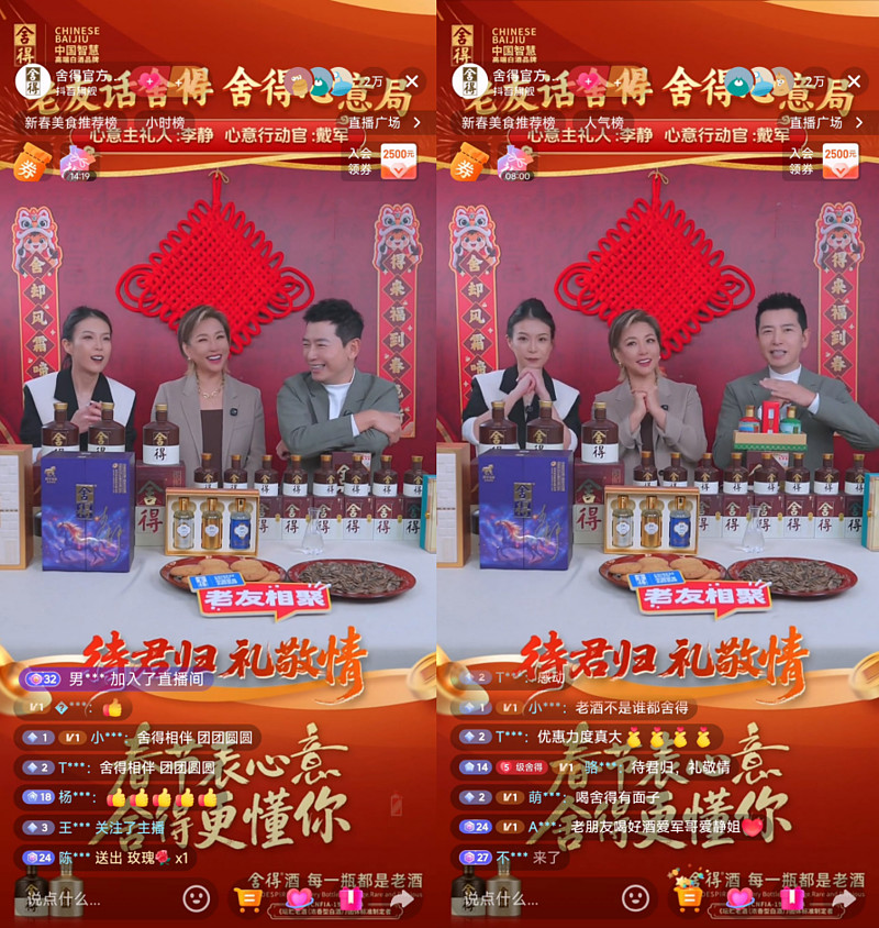 承接线上传播热度,2月1日晚,舍得酒特邀“心意代言团”李静、戴军做客舍得官方旗舰店抖音直播间。区别于传统直播带货,舍得酒用“老友+老酒”延续心意主题,打造出一场“强互动、深共鸣、高转化”的深度沟通场。