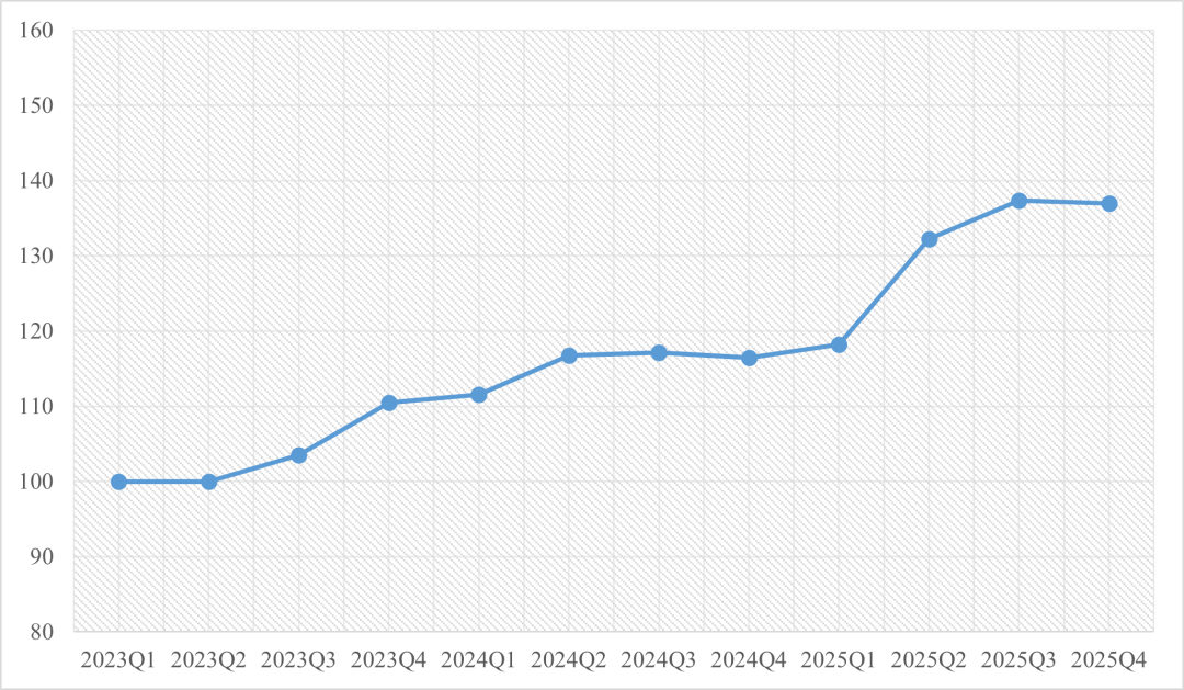 (二)运输时效指数小幅上升,班列运行稳定性持续提升2025年第四季度,弘景·天津港海铁联运运输时效指数为126.01点,较上季度上升4.65点。班列运行稳定性有所提升,主要场站装卸效率、港口装卸效率基本稳定。与去年同期相比,运输时效指数下降1.16点。