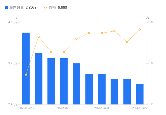 近一年(2025年2月28日至2026年2月27日),大连热电A股股东户数从4.21万户,减低至2.8万户,降幅33.47%,区间股价上涨4.39%。