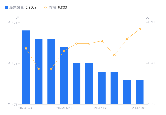 近一年(2025年3月10日至2026年3月10日),大连热电A股股东户数从4.16万户,减低至2.8万户,降幅32.69%,区间股价上涨9.50%。