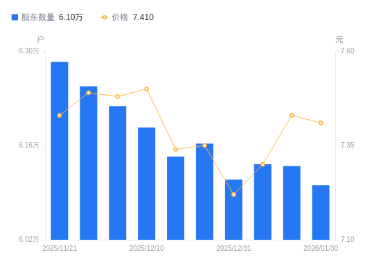 近一年(2025年2月24日至2026年1月30日),中交设计A股股东户数从5.47万户,增加至6.1万户,增幅11.61%,区间股价下跌11.59%。