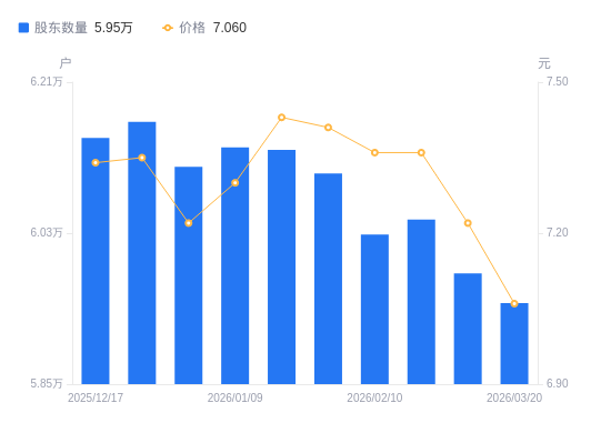 3月25日消息,数据显示,截至2026年3月20日,中交设计A股股东总户数为5.95万户,较上期(2026年3月10日)减少354户,降幅0.59%。公司最新A股总股本为22.95亿股,其中流通A股10.09亿股,户均持有流通A股数量为1.7万股,较上期增加100.41股,增幅0.60%;户均持流通A股市值11.98万元,较上期减少1989.94元,降幅1.63%。