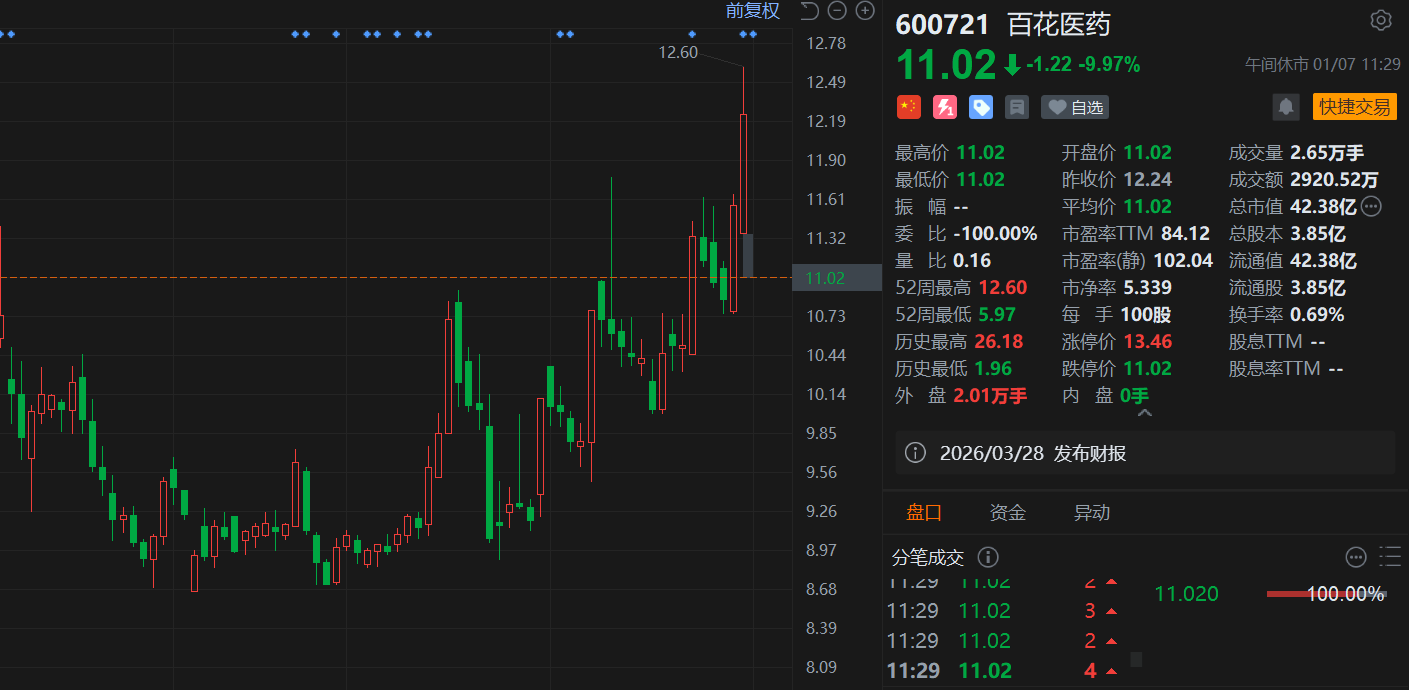 百花医药(600721.SH)今日复牌一字板跌停,目前封单金额高达3.24元,现报11.2亿元,总市值42.38亿元。消息上,百花医药昨日盘后公告,因公司控股股东、实际控制人与交易对方未就控制权变更相关重大事项达成一致意见,决定终止本次控制权变更事项。业绩方面,2025年前三季度,百花医药营收为2.986亿元,同比增长2.74%,净利润3267万元,同比增长36.41%。