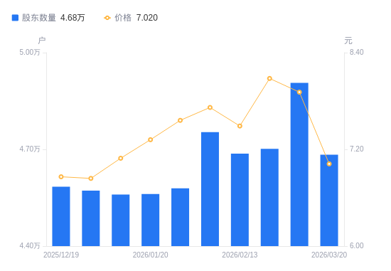 近一年(2025年3月20日至2026年3月20日),鲁北化工A股股东户数从4.89万户,减低至4.68万户,降幅4.28%,区间股价下跌8.59%。