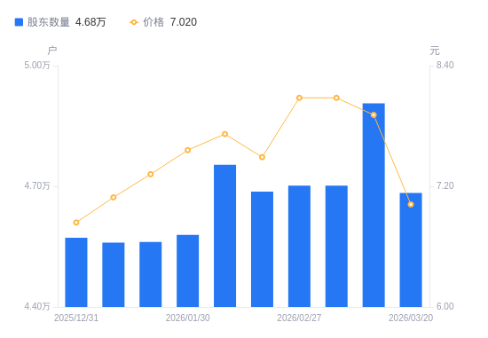 近一年(2025年2月28日至2026年2月28日),鲁北化工A股股东户数从4.97万户,减低至4.7万户,降幅5.43%,区间股价上涨13.01%。