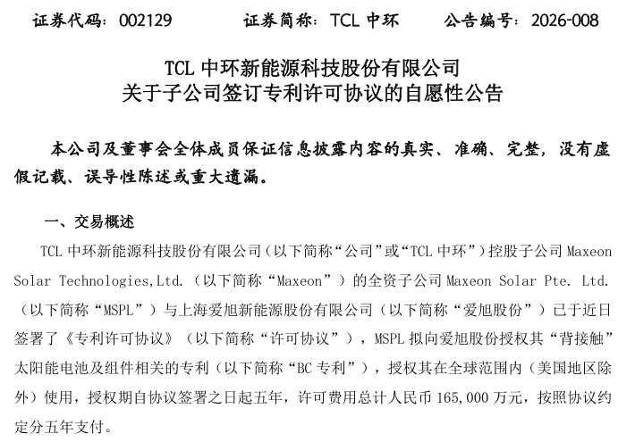 数字新能源DataBM.com获悉,2月6日晚间,TCL中环发布公告称,公司控股子公司Maxeon的全资子公司Maxeon Solar Pte. Ltd.(以下简称“MSPL”),已与爱旭股份于近日签署了《专利许可协议》。