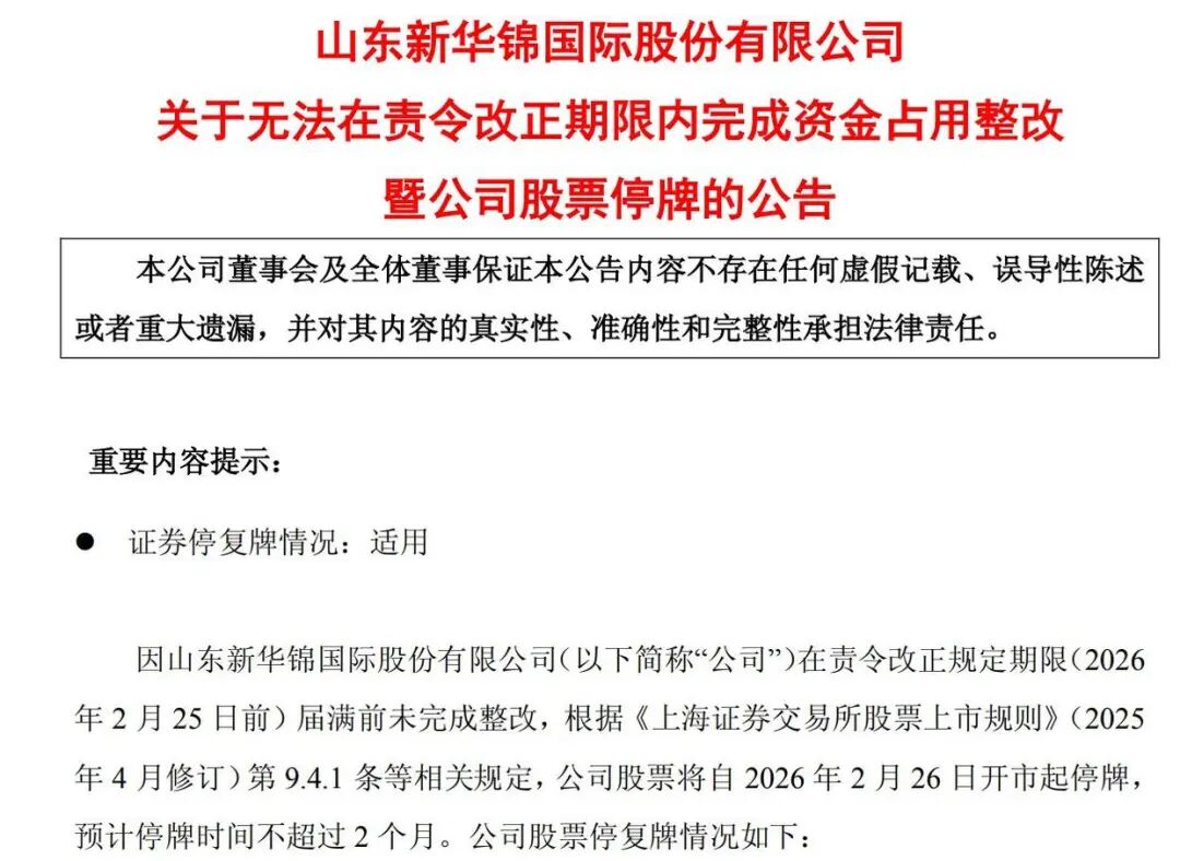 就在立案公告披露的同一天,ST新华锦另一份公告确认了更严峻的现实:因未在青岛证监局责令改正的期限(2026年2月25日前)内完成资金占用整改,根据《上海证券交易所股票上市规则》(2025年4月修订)第9.4.1条等相关规定,公司股票自2月26日开市起正式停牌,预计停牌时间不超过2个月。
