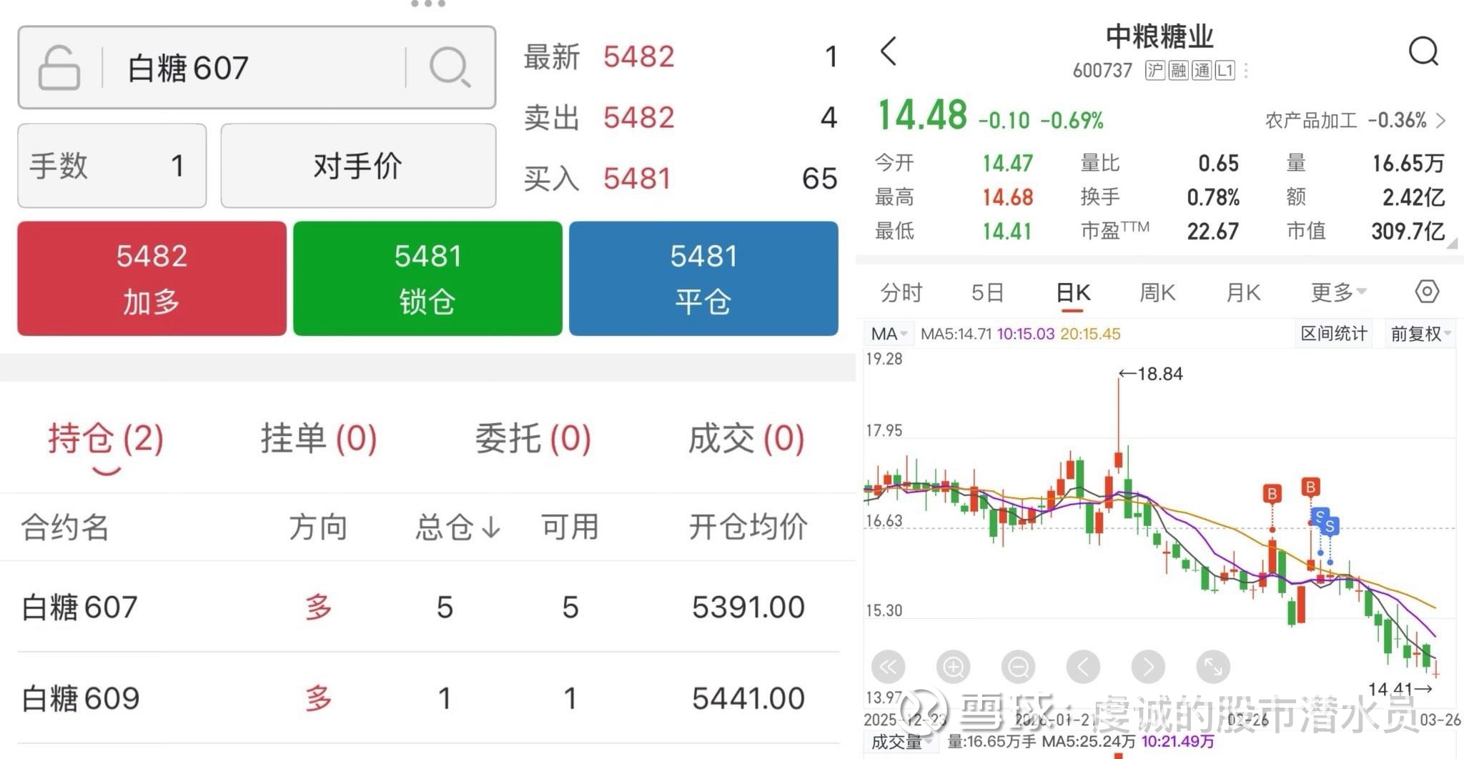 中粮糖业,属于买错,小亏清仓。当前持有郑白糖期货多单。