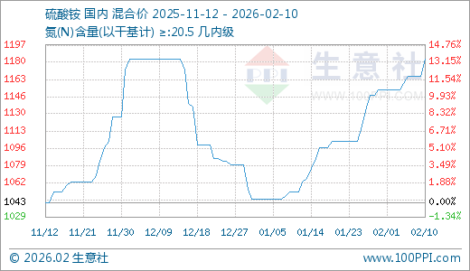 据生意社监测,硫酸铵02月10日最新价格1183.33元/吨,最近30天上涨12.34%。