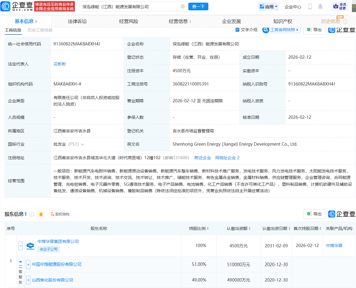 企查查APP显示,近日,深泓绿能(江西)能源发展有限公司成立,法定代表人为花彬彬,注册资本为4500万元,经营范围包含:新能源汽车电附件销售,新能源原动设备销售,新能源汽车整车销售,供应链管理服务等。企查查股权穿透显示,该公司由中煤华晋集团有限公司全资持股,后者由中煤能源(601898)(601898.SH)、山西焦化(600740)(600740.SH)共同持股。
