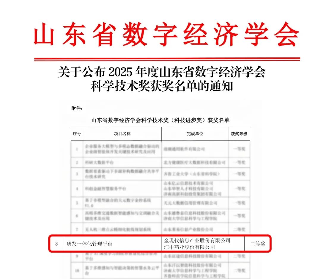 近日,山东省数字经济学会公布了2025年度科学技术奖获奖名单。由金现代(300830)信息产业股份有限公司与江中药业股份有限公司联合申报的“研发一体化管理平台”项目,凭借其在研发数字化领域的创新成果与显著应用成效,荣获“科技进步奖二等奖”。