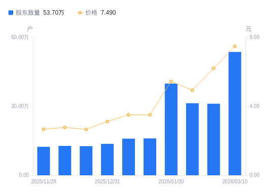 3月17日消息,数据显示,截至2026年3月10日,洲际油气A股股东总户数为53.7万户,较上期(2026年2月27日)增加22.54万户,增幅72.34%。公司最新A股总股本为41.49亿股,其中流通A股41.44亿股,户均持有流通A股数量为7716.46股,较上期减少5582.1股,降幅41.98%;户均持流通A股市值5.78万元,较上期减少2.48万元,降幅30.02%。