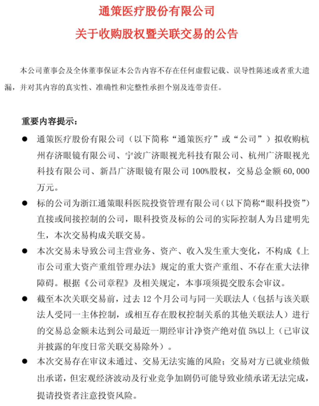通策医疗关于收购股权暨关联交易的公告