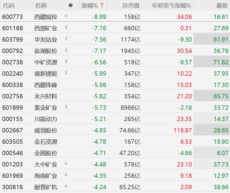 格隆汇3月16日|A股市场锂矿股集体下跌,其中,西藏城投跌近9%,西部矿业、华友钴业、盐湖股份跌超7%,中矿资源跌超6%,盛新锂能、西藏珠峰、永兴材料、紫金矿业、川能动力跌超5%,威领股份、金石资源、金圆股份、大中矿业、海南矿业、耐普矿机跌超4%。
