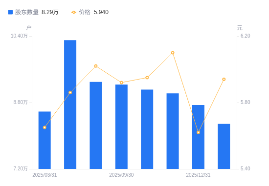 3月30日消息,数据显示,截至2026年2月28日,中储股份A股股东总户数为8.29万户,较上期(2025年12月31日)减少4541户,降幅5.20%。公司最新A股总股本为21.7亿股,其中流通A股21.7亿股,户均持有流通A股数量为2.62万股,较上期增加1360.68股,增幅5.48%;户均持流通A股市值15.56万元,较上期增加1.6万元,增幅11.49%。
