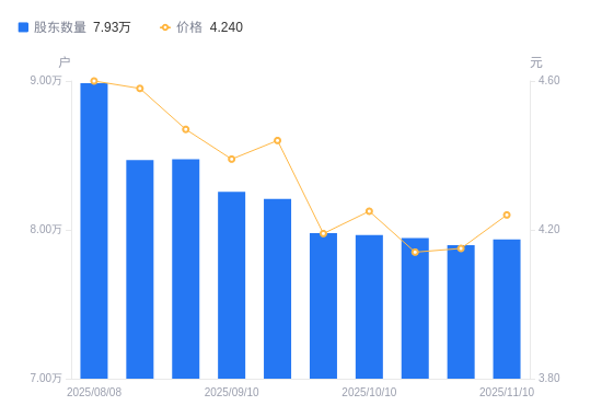 近一年(2024年11月20日至2025年11月10日),保税科技A股股东户数从5.88万户,增加至7.93万户,增幅34.95%,区间股价上涨17.78%。