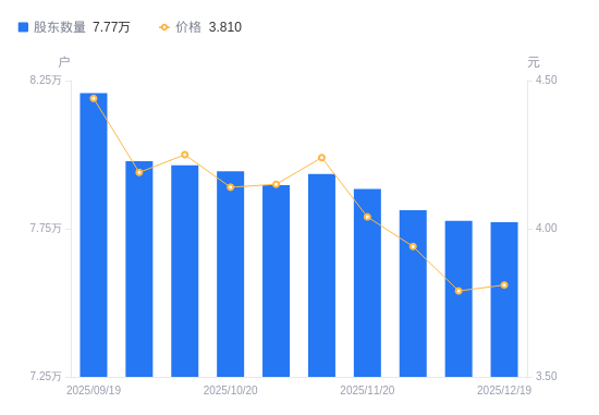 近一年(2024年12月20日至2025年12月19日),保税科技A股股东户数从5.72万户,增加至7.77万户,增幅35.97%,区间股价上涨3.53%。