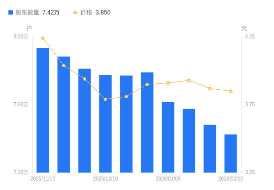 近一年(2025年2月10日至2026年2月10日),保税科技A股股东户数从5.57万户,增加至7.42万户,增幅33.33%,区间股价上涨9.69%。