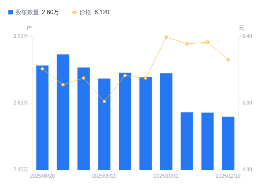 近一年(2024年12月31日至2025年12月10日),钱江生化A股股东户数从3.54万户,减低至2.6万户,降幅26.56%,区间股价上涨5.90%。