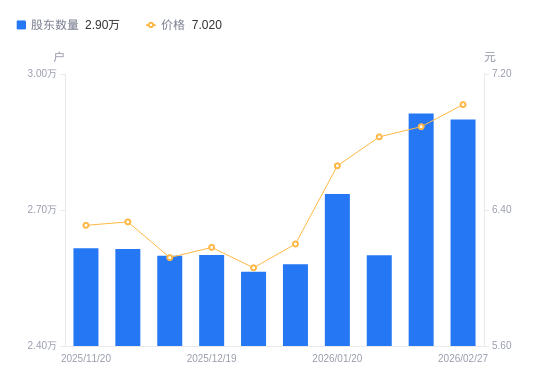 3月2日消息,数据显示,截至2026年2月27日,钱江生化A股股东总户数为2.9万户,较上期(2026年2月10日)减少132户,降幅0.45%。公司最新A股总股本为8.67亿股,其中流通A股3.11亿股,户均持有流通A股数量为1.07万股,较上期增加48.68股,增幅0.46%;户均持流通A股市值7.54万元,较上期增加1731.95元,增幅2.35%。