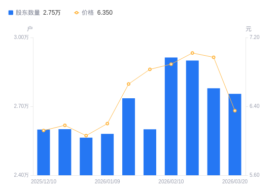 3月24日消息,数据显示,截至2026年3月20日,钱江生化A股股东总户数为2.75万户,较上期(2026年3月10日)减少246户,降幅0.89%。公司最新A股总股本为8.67亿股,其中流通A股3.11亿股,户均持有流通A股数量为1.13万股,较上期增加100.1股,增幅0.89%;户均持流通A股市值7.18万元,较上期减少6313.48元,降幅8.08%。