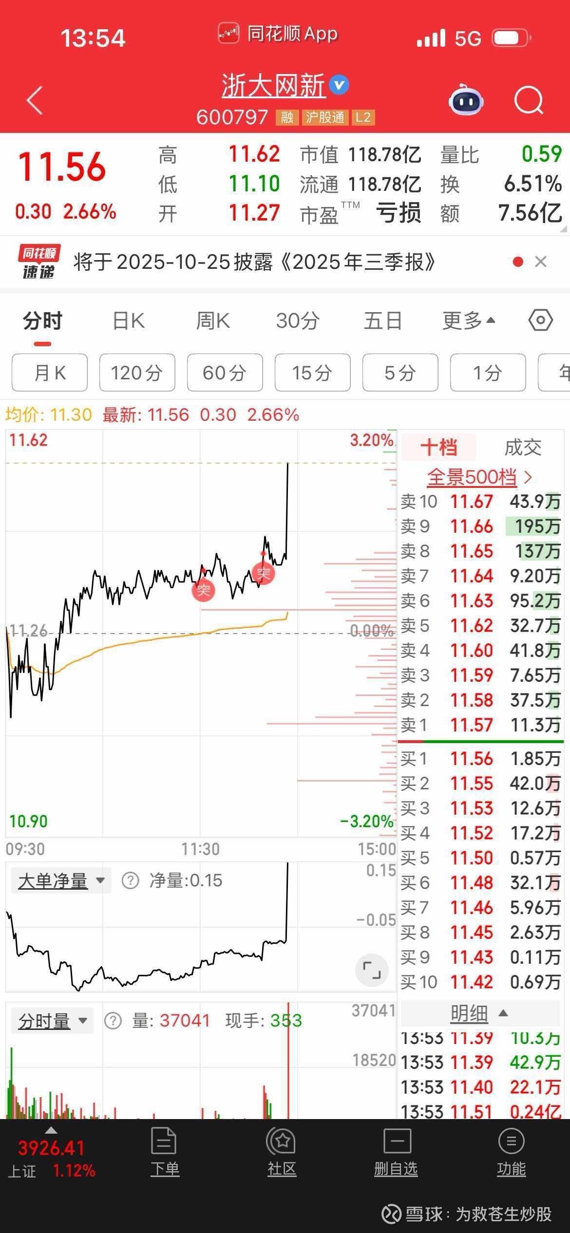 发现一只好票需要观察。前提是站上11.50以上才行。浙大网新。主力吸得欢也洗得给力。不上11.50不看。