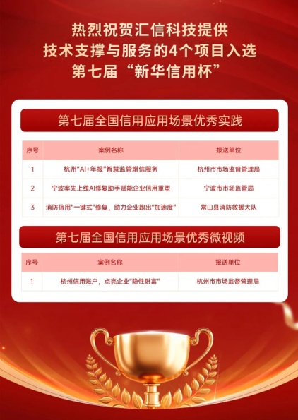 本次获奖的四个项目均由汇信科技携手地方政府共同打造,涵盖市场监管、企业信用修复、政务服务等多个领域,是对汇信科技在推动社会信用体系数字化、智能化、场景化建设方面的实力的高度肯定。