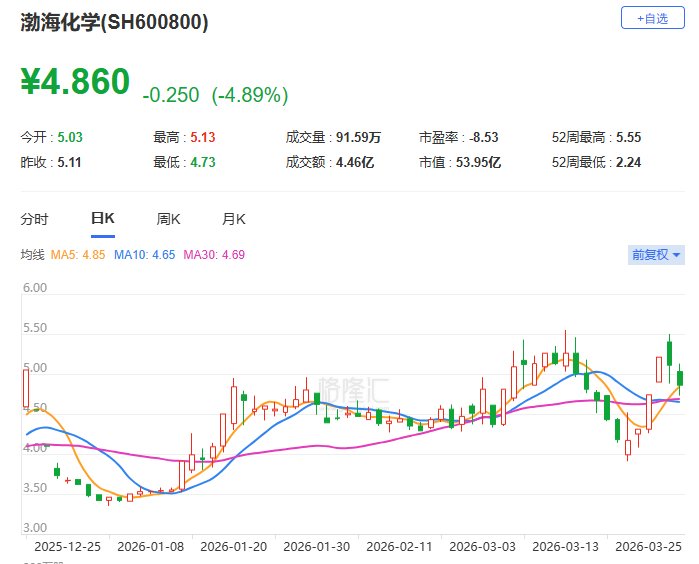 渤海化学(600800.SH)现跌4.89%报4.86元,最新市值54亿元。渤海化学公布,2025年度,公司实现营业收入33.3亿元,较上年同期减少30.39%;实现利润总额-64,483.17万元,较上年同期增亏1,307.52万元;实现归属于上市公司股东的净利润-64,634.23万元,较上年同期增亏1,419.93万元。(格隆汇)