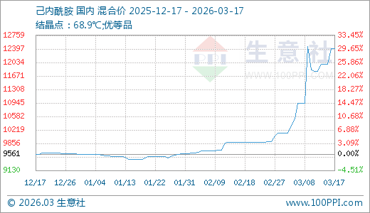 己内酰胺03月17日最新价格12407.50元/吨,最近5天上涨5.26%,10天上涨13.44%,20天上涨25.33%,30天上涨25.62%,60天上涨31.53%。