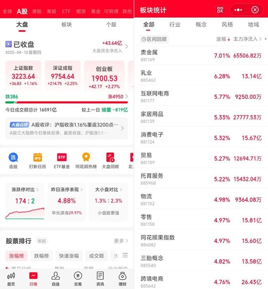 4月10日,近5000只个股上涨,上涨个股为4950只,174只个股涨停;386只个股下跌,仅*ST东方(维权)(600811)、*ST富润(维权)(600070)2只个股跌停。