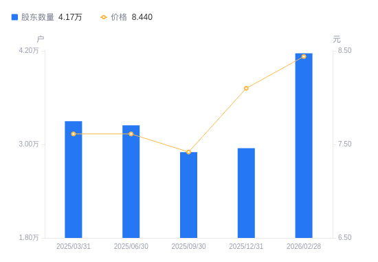 近一年(2024年12月31日至2025年12月31日),杭州解百A股股东户数从4.33万户,减低至2.95万户,降幅31.76%,区间股价上涨0.97%。