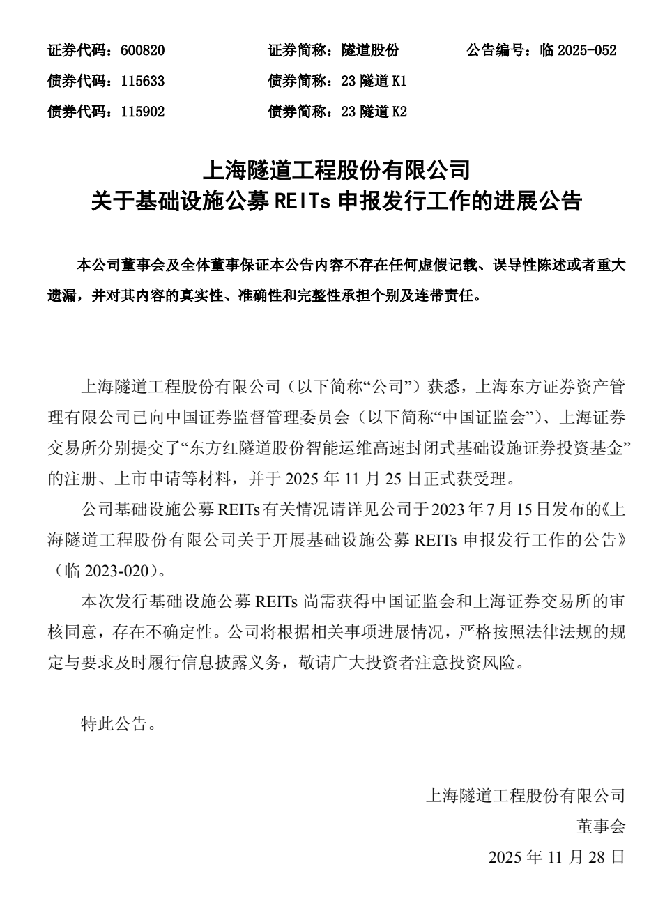 11月25日,由隧道股份(600820)作为发起人,以旗下钱江通道及接线工程过江隧道段(钱江隧道)作为底层资产的“东方红隧道股份智能运维高速封闭式基础设施证券投资基金”(钱江隧道REIT)获中国证监会、上海证券交易所受理。