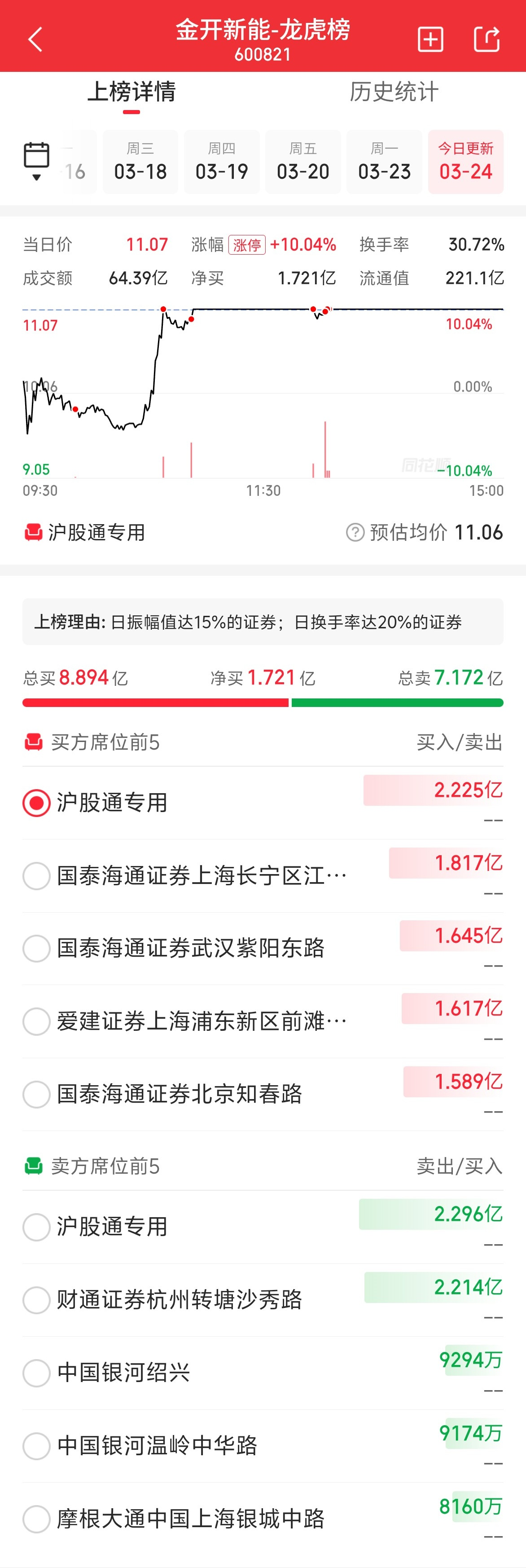 3月24日,金开新能(600821)(600821.SH)当日收报11.07元,涨跌幅10.04%,偏离值30.72%,换手率30.72%,成交额64.39亿。盘后龙虎榜数据显示,国泰海通证券上海长宁区江苏路证券营业部当然净买入居首,为1.817亿元,公开资料显示,该席位为是章盟主的核心常用游资席位。
