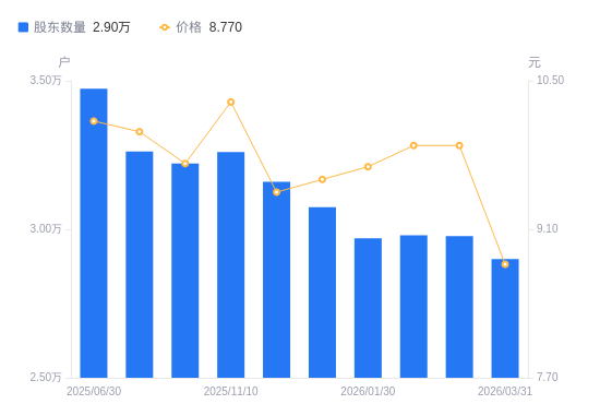 近一年(2025年3月31日至2026年3月31日),香溢融通A股股东户数从3.49万户,减低至2.9万户,降幅16.95%,区间股价下跌9.26%。