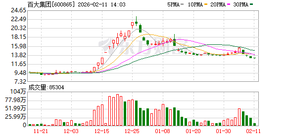 截至2月11日10点19分,百大集团的股价13.06元/股,总市值49亿元。