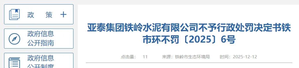 近日,辽宁省铁岭市生态环境局发布亚泰集团(600881)铁岭水泥有限公司不予行政处罚决定书。