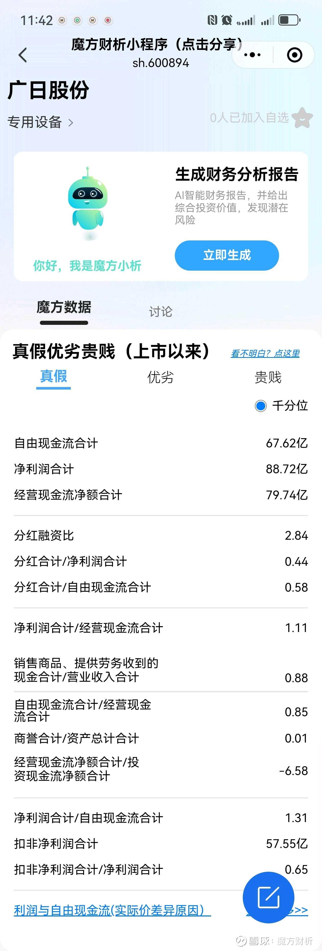 半年报好的几个地方,1,分红10派1,维持一年分两次红虽然少了点。2,账上现金越来越多。有接近50亿。3日立电梯只值27亿的价值,每年带来的分红却有6亿左右。这个很香,对于这份半年报,非喜非忧。富安娜那些消费业绩下降的更厉害。咱们账上现金多具有一定的缓冲作用。别的话...