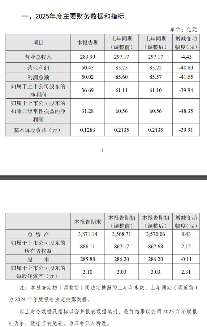3月31日,三峡能源(600905)(600905.SH)披露2025年年度业绩快报,全年营业总收入283.99亿元,上年同期297.17亿元,同比下降4.43%;利润总额50.02亿元,上年同期85.57亿元,同比下降41.55%;归属于上市公司股东的净利润36.69亿元,上年同期61.10亿元,同比下降39.94%;归属于上市公司股东的扣除非经常性损益的净利润31.28亿元,上年同期60.56亿元,同比下降48.35%;基本每股收益0.1283元,上年同期0.2135元,同比下降39.91%。