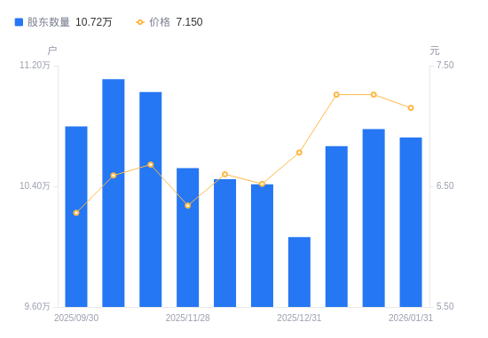 近一年(2025年2月28日至2026年1月31日),华安证券A股股东户数从12.36万户,减低至10.72万户,降幅13.24%,区间股价上涨26.10%。