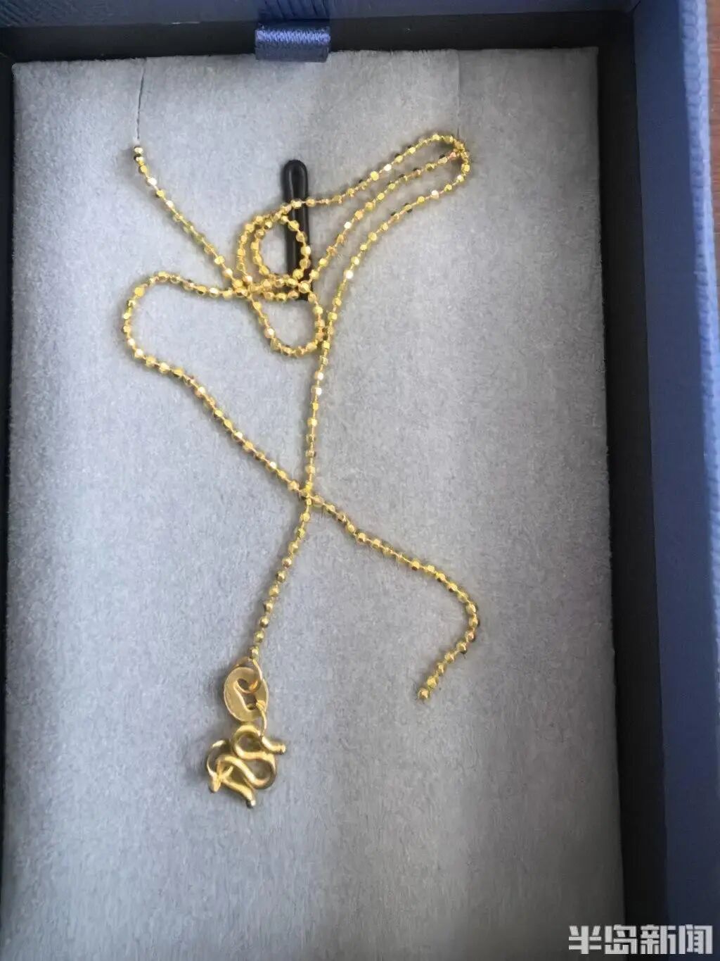断裂后的项链据江女士介绍,今年2月28日,她对象在中国黄金这家店购买了一条珠链样式的足金项链,质量为3.46克,加上每克188元的工费,项链共计花费5868元,另外还购买了一个价值2564元的足金吊坠,共花费了8432元。“当时买这个黄金首饰,主要想送给我作为‘三八’节礼物的。”江女士说,由于自己当时并不在青岛,购买以后,首饰带着原包装被放置起来。等到3月7日,其对象把首饰带到了济南,当面送给了江女士。等打开要佩戴时两人才发现,“项链不知道什么时候断裂成两截了”。